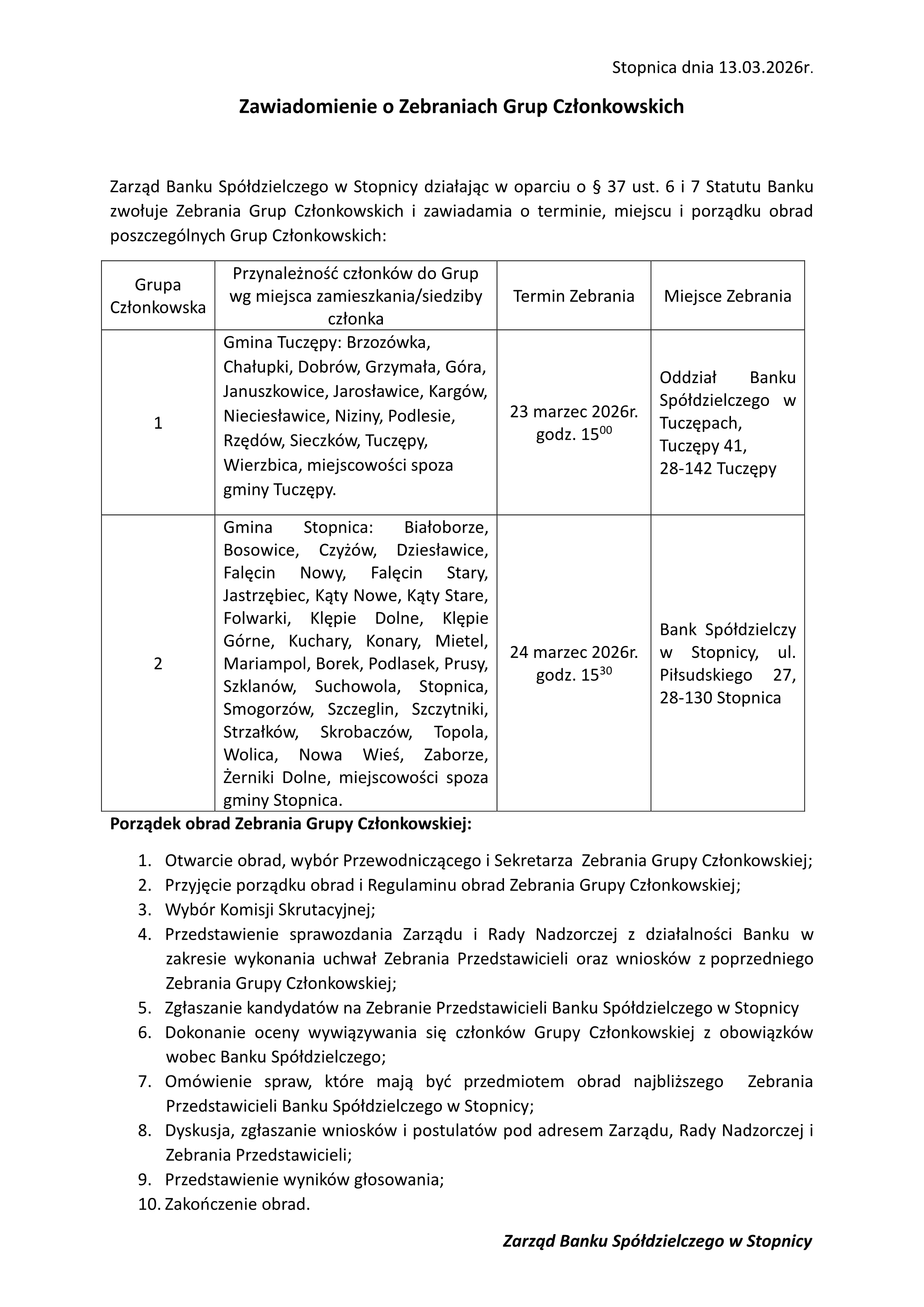 Zawiadomienie o Zebraniach Grup Członkowskich